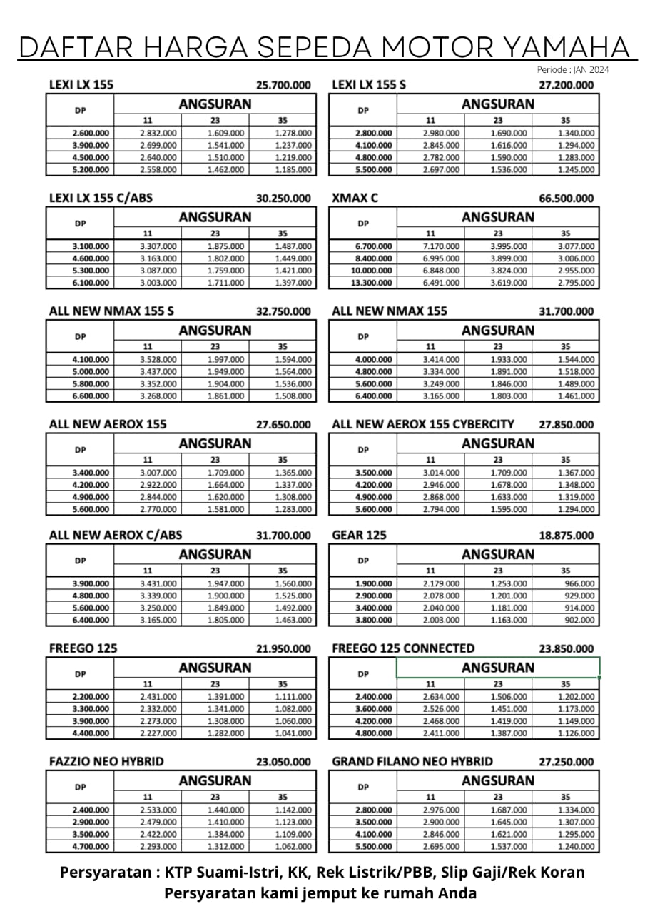 Aerox Alpha, Aerox Alpha Turbo, Nmax Turbo Neo Version, Yamaha Fazzio, Nmax Turbo YECVT, All New Aerox Cybercity, All New Aerox 155, Grand Filano, Lexi LX, Promo kredit Bandung Cimahi