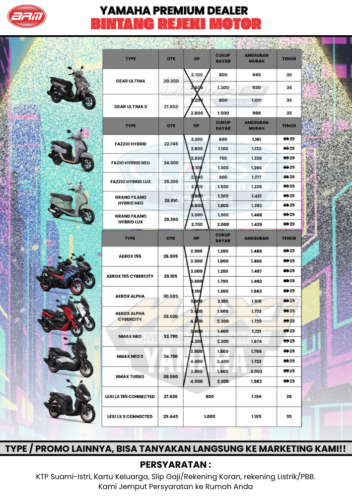 Gear Ultima, Aerox Alpha, Aerox Alpha Turbo, Nmax Turbo Neo, Yamaha Fazzio, Nmax Turbo YECVT, All New Aerox Cybercity, Grand Filano, Lexi LX, Promo kredit Bandung Cimahi
