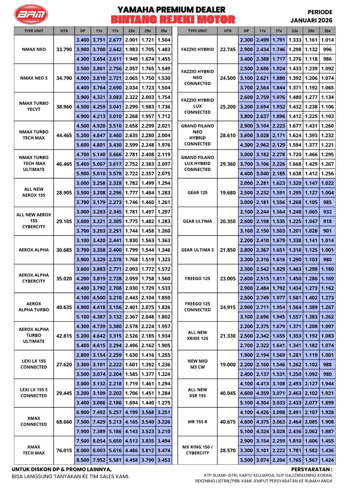 Aerox Alpha, Aerox Alpha Turbo, Nmax Turbo Neo Version, Yamaha Fazzio, Nmax Turbo YECVT, All New Aerox Cybercity, All New Aerox 155, Grand Filano, Lexi LX, Promo kredit Bandung Cimahi